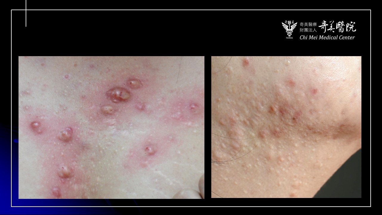 33歲的林小姐,無特殊慢性疾病史,兩個月前,臉部出現多處疼痛的紅色丘疹及膿皰,開始不以為意,未立即就醫治療,然而病灶卻逐漸增多且惡化,趕忙至奇美醫療財團法人奇美醫院皮膚科暨醫學美容中心主治醫師陳麒亘門診就診。